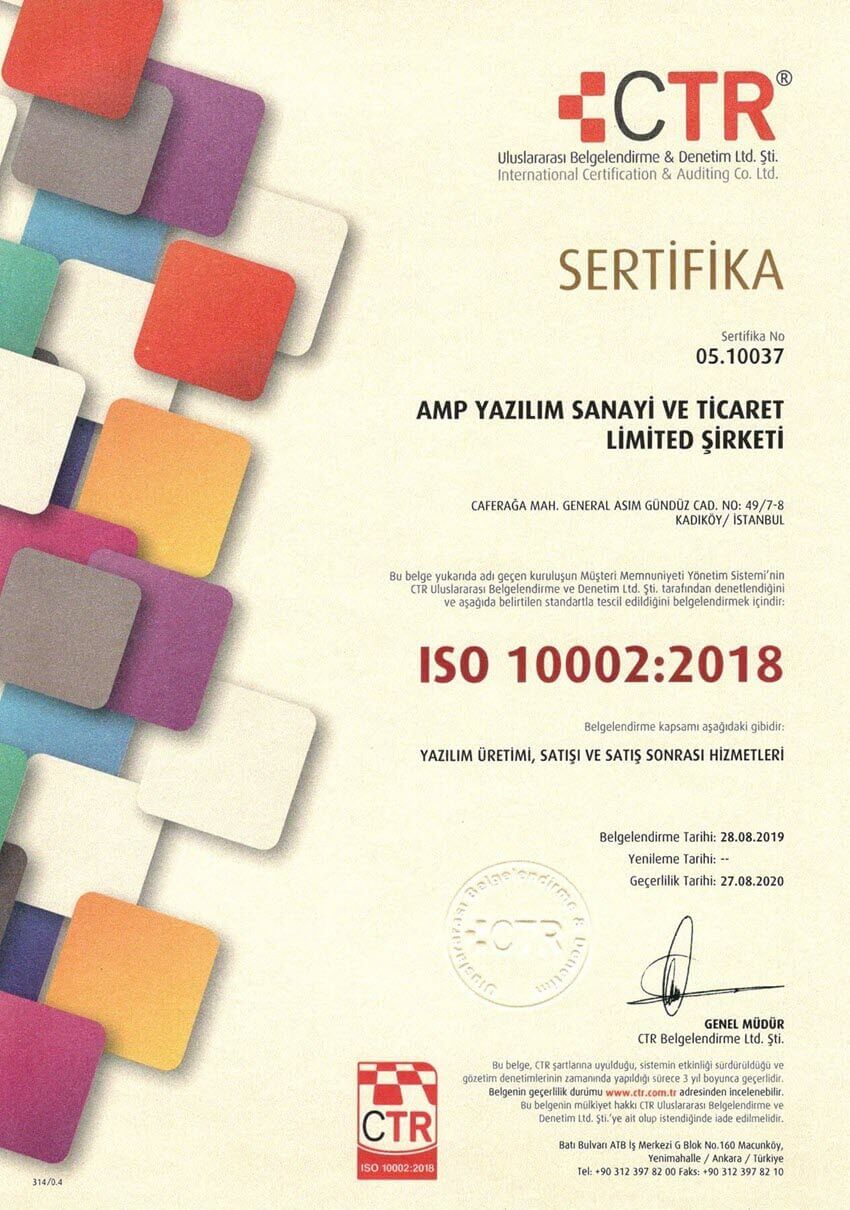 AMP Yazılım olarak, yazılım üretimi, satışı ve satış sonrası hizmetlerimizde kaliteyi yükseltmek için sürekli çalışıyoruz. Siz değerli müşterilerimize daha iyi hizmet vermek için kalitemizi sürekli geliştiriyor ve denetletiyoruz. Bu bağlamda hizmetlerimizin ISO 10002:2018 koşullarını sağladığı denetlendi ve sertifikalandırıldı. Sertifikamızı sizlerle paylaşmayı görev biliriz.