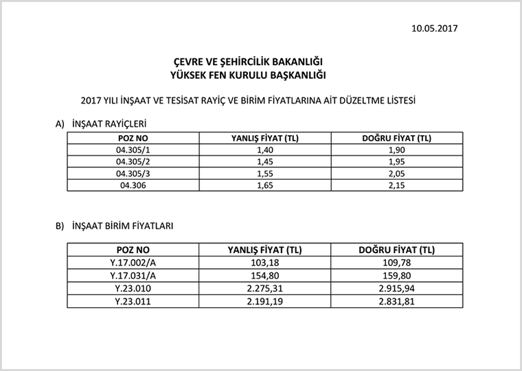 Çevre ve Şehircilik Bakanlığı her yıl yayınladığı birim fiyatlardaki hatalarla ilgili bir düzeltme cetveli yayınlamaktadır. 2017 Yılı Çevre ve Şehircilik Bakanlığı Birim Fiyatları 27.02.2017 tarihinde yayınlanmıştı. 10.05.2017 tarihinde de bu yıl yayınlanan fiyatlardaki düzeltme listesi yayınlandı. Bu listede düzeltilen pozlar şu şekildedir.