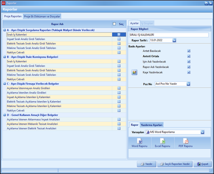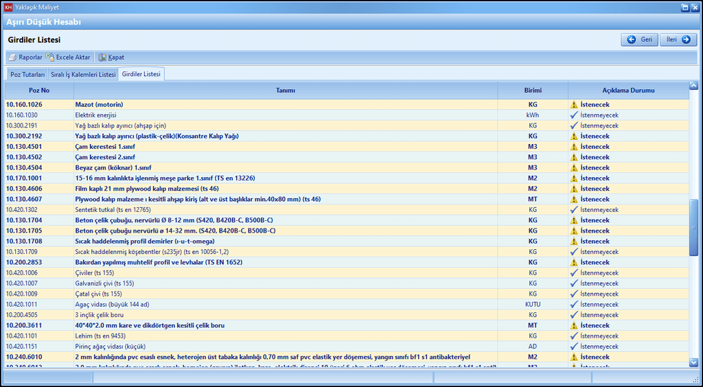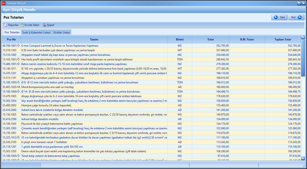 Aşırı düşük sorgu çalışmalarında ilk aşama yaklaşık maliyeti oluşturan tüm kalemlerin iş grubu ayrımı yapılmaksızın tek bir listede toplanarak tutarların toplamının poz bazında bulunmasıdır. Aşağıdaki pencerede görüleceği üzere sadece imalat tutarları değil aynı zamanda bu pozların Boru Montaj ve Nakliye Tutarları da dikkate alınmaktadır (Anahtar Götürü Bedel İşler için).