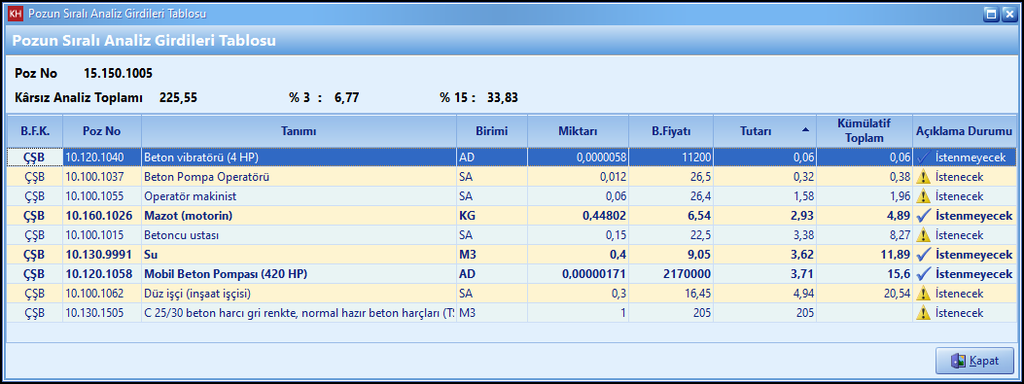 İlgili analizin karsız toplamının %3 ve %15’i hesaplanır. Rayiç tutarı %3’ün altında kalan kalemler (işçilikler hariç) sorgu dışında tutularak açıklama istenmeyen analiz girdileri listesine eklenir. Ancak rayiç tutarı %3 altında kalan rayiçlerin kümülatif toplamı, analiz karsız toplamının %15’ini geçtiğinde, %15’i geçen ilk kalem ve devamı açıklama istenmeyen analiz girdileri listesinden çıkartılarak açıklama istenen analiz girdi tabloları listesine eklenir.