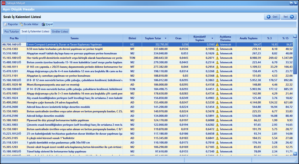 Her iş kalemi için tutar hesabı yapıldıktan sonra iş kalemleri tutarları büyükten küçüğe olacak şekilde sıralanarak sıralı iş kalemleri listesi oluşturulur. Bu listede yaklaşık maliyetin %80’ini oluşturan pozlar açıklama istenecek olarak kabul edilmektedir. Bunun dışında kalan kalemler için detaylı sorgulama ve ispat istenmeyecektir. Söz konusu kalemler “İstenmeyecek” olarak işaretlenmiştir.