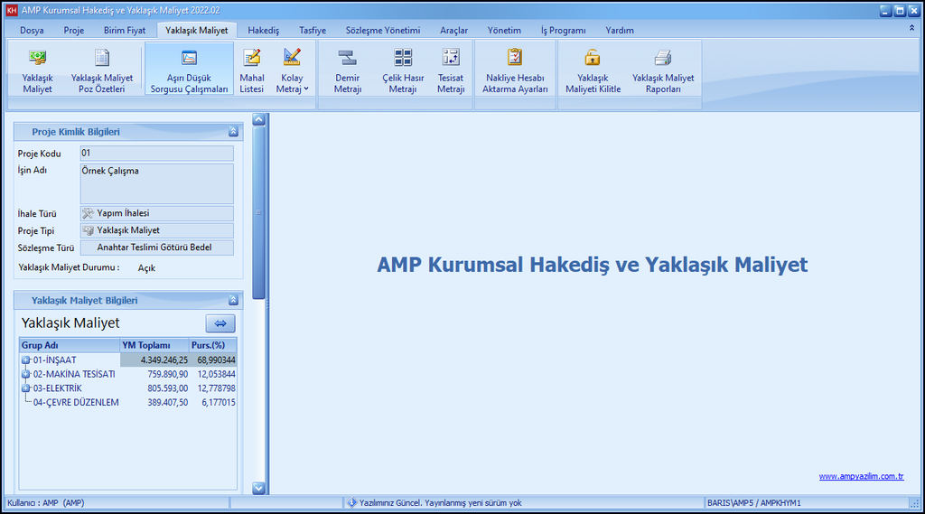AMP Hakediş ve Yaklaşık Maliyet programında bu hesap tek bir komut ile gerçekleştirilebilmekte olup kesin sonuç üretmektedir.
