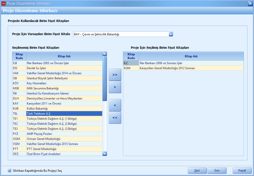 Projede kullanacağınız birim fiyat kitaplarını seçin ve Son’a basın.