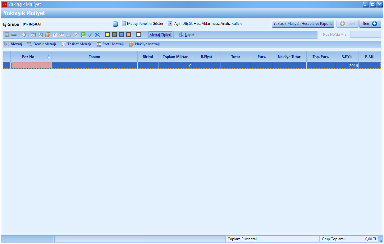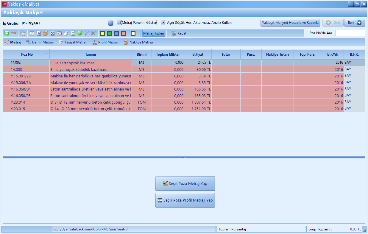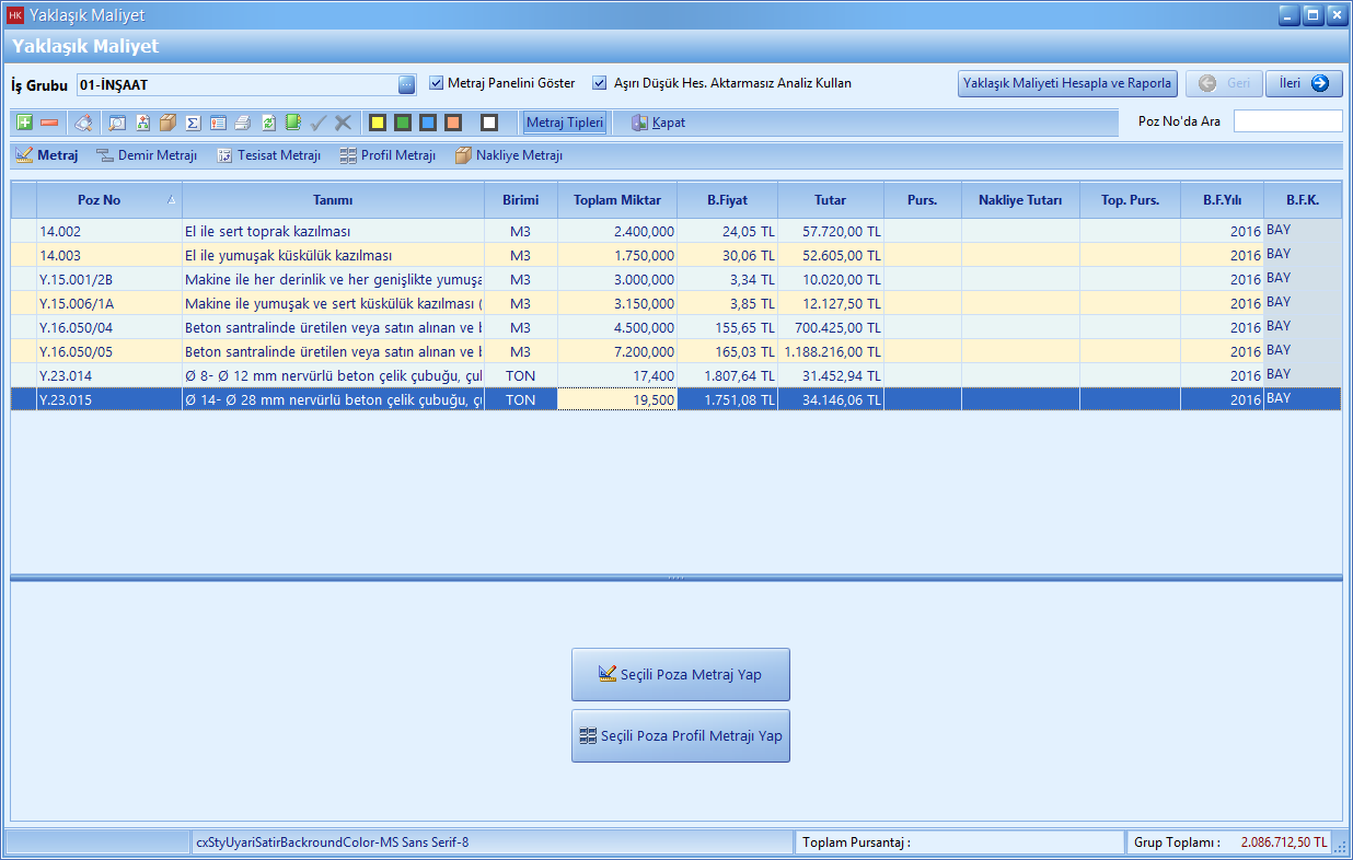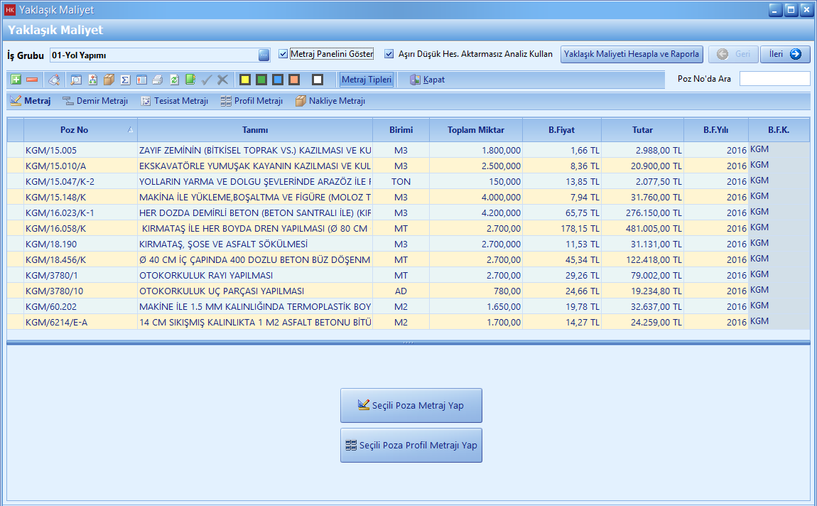 Eklediğiniz pozlara miktar – metraj girişlerinizi yapın ve ileri düğmesine basın. İleri düğmesine bastığınızda program yaklaşık maliyetinizi ve nakliyelerinizi otomatik olarak hesaplayacaktır.