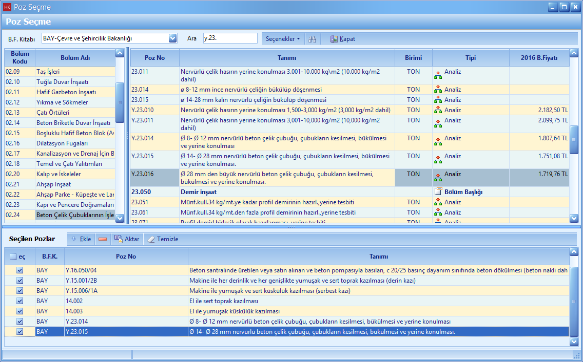 Açılan pencerede, idarelere ait pozlar bulunmaktadır. Projenizde kullanacağınız pozları çift tıklayarak seçin ve Aktar düğmesine basın.