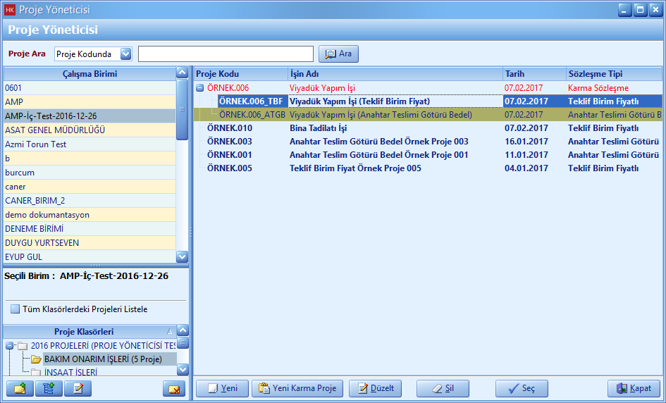 AMP Kurumsal Hakediş ve Yaklaşık Maliyet programında karma bir proje yani bünyesinde hem Anahtar Teslim Götürü Bedel hem de Teklif Birim Fiyatı bulunduran bir iş oluşturabilirsiniz. Bunun için proje yöneticisinde Yeni Karma Proje düğmesine basın. Açılan pencerede Proje Kodunuzu, işin adını, kullanılacak birim fiyat yılını, projede aşırı düşük hesabı yapılıp yapılmayacağını, nakliye verilip verilmeyeceğini ve verilecekse hangi nakliye şablonundan verileceğini seçip Kaydet’e basın.