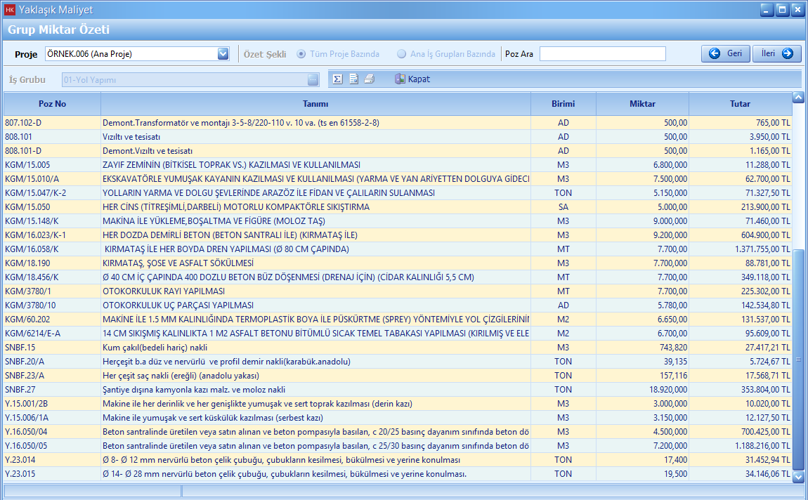 Bu adımda grup miktar özetlerini görürsünüz. İsterseniz tüm proje bazında isterseniz de ana iş grupları bazında gösterim yapabilirsiniz. Tekrar ileri düğmesine basın.