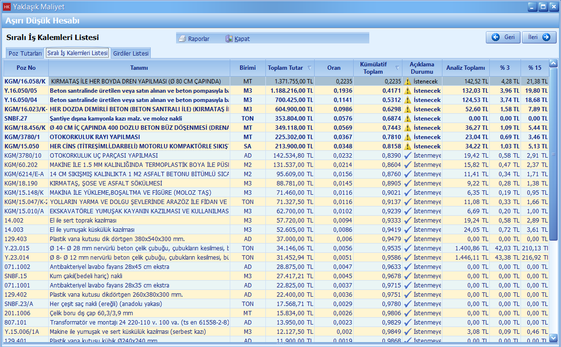 Aşırı düşük sorgulama işlemi program tarafından gerçekleştirilir. Burada program mevzuat gereği bütün proje bazında bir aşırı düşük sorgulama hesabı yapar ve size açıklama istenecek ve istenmeyecek iş kalemlerinin ve rayiçlerin listesini döker.
