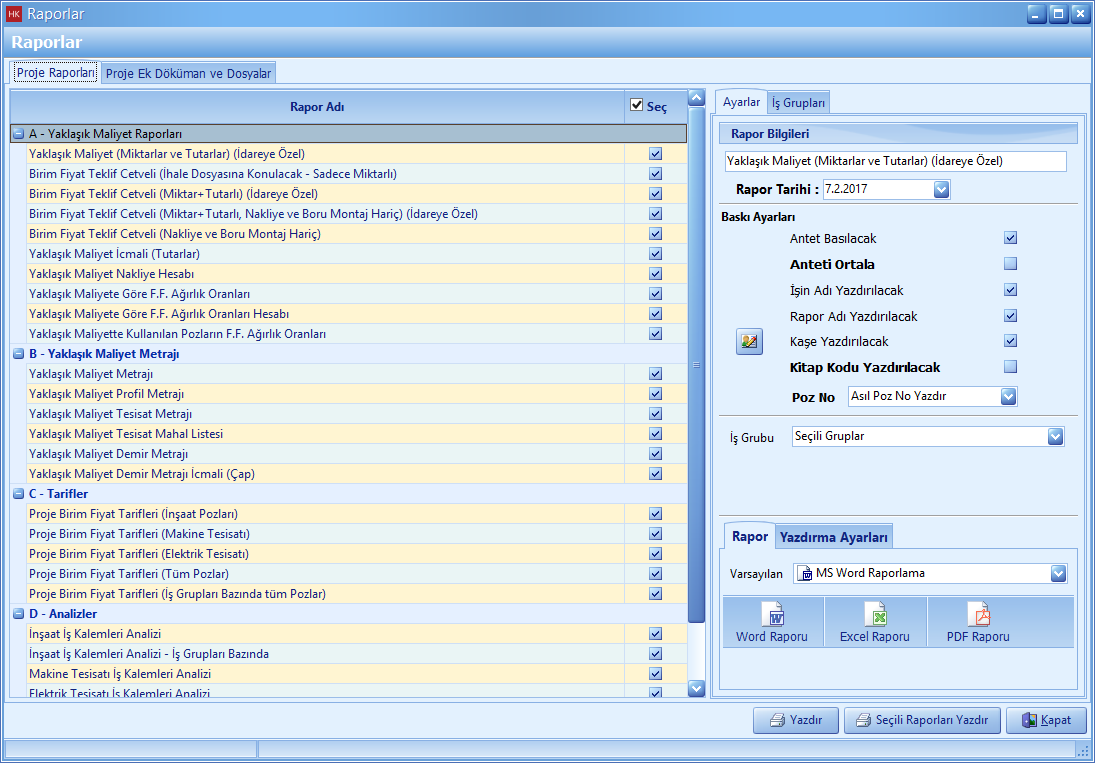 Tebrikler Karma bir projede Yaklaşık Maliyetinizi oluşturdunuz. Şimdi sıra rapor almakta. Raporları ister Word formatında ister Excel formatında ya da PDF formatında alabilirsiniz.