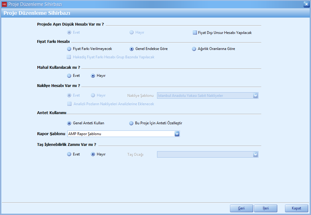 Program sizden önce karma projenin anahtar teslim götürü bedel proje ayarlarını yapmanızı ister. Bu noktada pursantajların genel toplama göre mi yoksa iş gruplarına göre mi hesaplanacağını seçmelisiniz. Ayrıca işin Anahtar Teslim Götürü Bedel kısmında fiyat farkı verilecekse, fiyat farkı kısmından genel endekse göre fiyat farkı ver ya da ağırlık oranlarına göre fiyat farkı ver seçeneklerinden birini seçmelisiniz. Mahal kullanacaksanız mahal kullanacak seçeneğini seçin ve taş işlenebilirlik zammı ödenecekse de “Taş İşlenebilirlik Zammı Var” seçeneğini işaretleyip taş ocağını seçin ve ileriye basın.